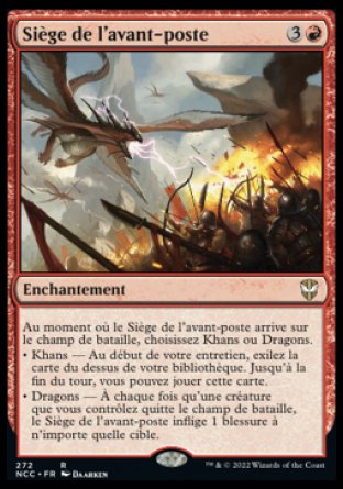 Le saviez-vous ? Les cinq cartes Citadel Siege, Monastery Siege, Palace Siege, Outpost Siege et Frontier Siege, de l'édition Fate Reforged, forment un cycle appelé "- Siege". Les cartes Mirrodin Besieged, Battle of Hoover Dam, Struggle for Project Purity et Phenomenon Investigators sont des références à ce cycle de par le fait de choisir un camp ou une attitude pour avoir un certain effet tant qu'on contrôle l'enchantement ou la créature. Ce cycle a inspiré un cycle similaire, paru dans l'édition Tarkir: Dragonstorm (voir cette anecdote). |