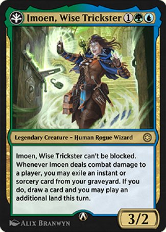 Whenever Imoen deals combat damage to a player, you may exile an instant or sorcery card from your graveyard. If you do, draw a card and you may play an additional land this turn.