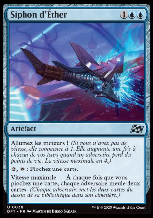 Vitesse maximale — À chaque fois que vous piochez une carte, chaque adversaire meule (Pour meuler une carte, un joueur met la carte du dessus de sa bibliothèque dans son cimetière.) deux cartes.
