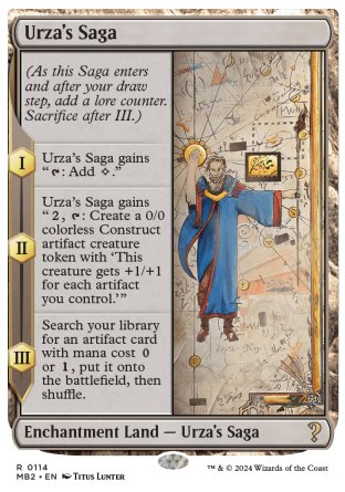 La carte Urza's Saga est le deuxième Terrain-Enchantement imprimé après la playtest card Enchanted Prairie, et contrairement à elle (voir les règles de légalité des cartes de l'édition Mystery Booster — Convention Edition), le premier légal en tournoi. Le nom de la carte est un jeu de mots en anglais autour : • du sous-type de terrain "Urza's", initialement conçu pour les cartes de l'"Urzatron" (voir cette anecdote), Urza's Mine, Urza's Power Plant et Urza's Tower, puis réutilisé pour Urza's Factory, Urza's Fun House, Urza's Workshop et Urza's Cave ; et • du sous-type d'enchantement "Saga". Les deux sous-types "Urza's" et "Saga" accolés, on obtient le nom de l'édition Urza's Saga - la carte porte le même nom qu'une édition (voir cette anecdote) ; la carte présente aussi ces sous-types, dont la traduction correcte en français serait "Terrain d'Urza et Saga" plutôt qu'"Épopée d'Urza". |