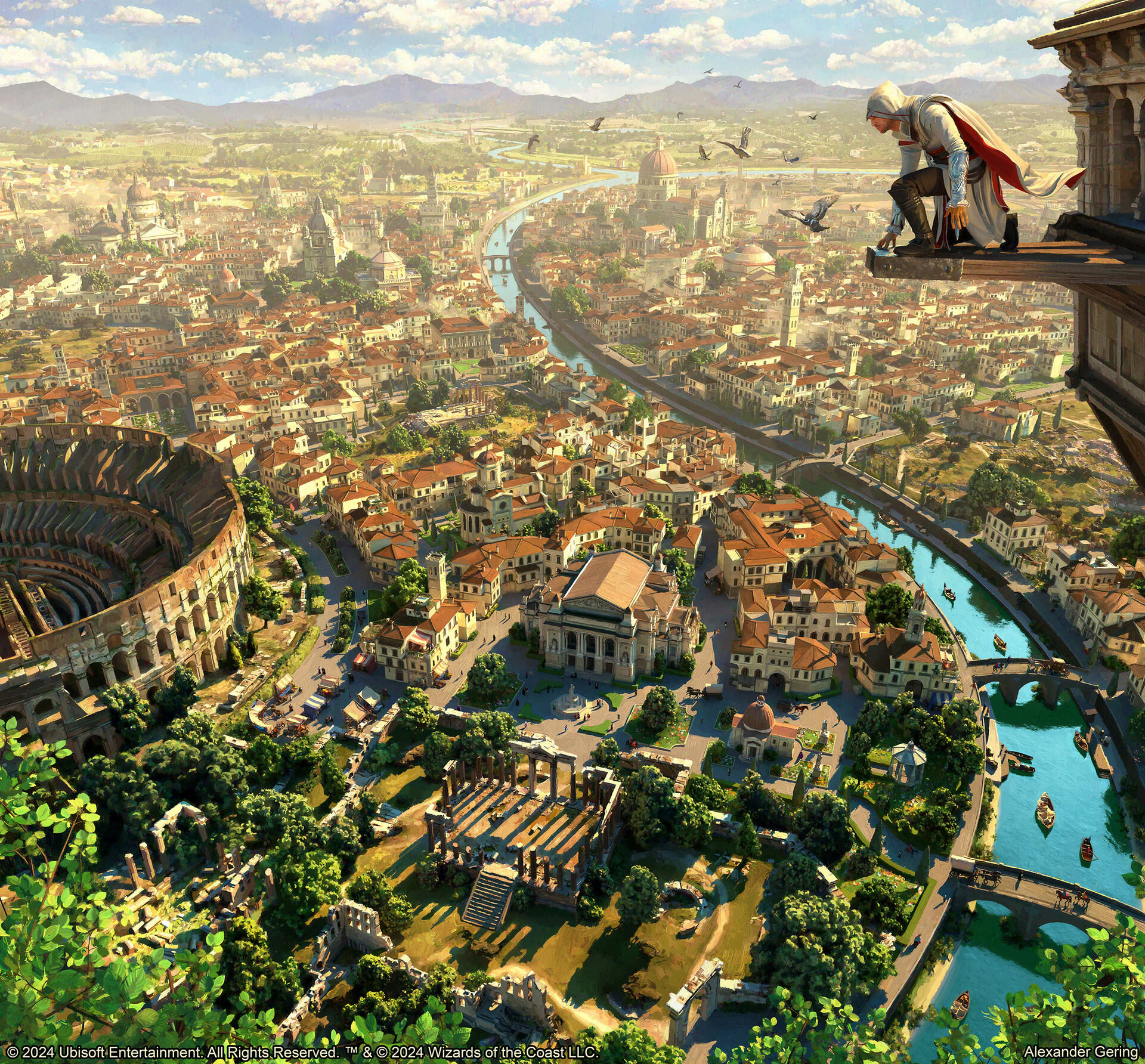 (Scene Cards - "The 6-card Rome Vista scene portrays Ezio, Auditore La Firenze in an exclusive scene treatment overlooking the beautiful city of Rome.") -