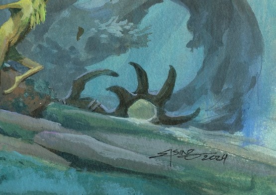 Coming back to Lorwyn is amazing. I was asked to be part of the design team for the Lorwyn Eclipsed set and worked with Deborah Garcia as the leading art deriector to try and be true to the original set while still coming up with new ideas. I did a lot of design work on the treefolk and was very excited when asked to do a legendary one for the set. In my sketch he had a long pointy nose but i felt he needed something more iconic to me a named caracther - so the twirly nose was added. The place reminded me of one of my first cards for magic: Thornbite Staff. If you look closely you can see its till laying there; even after all these years.
